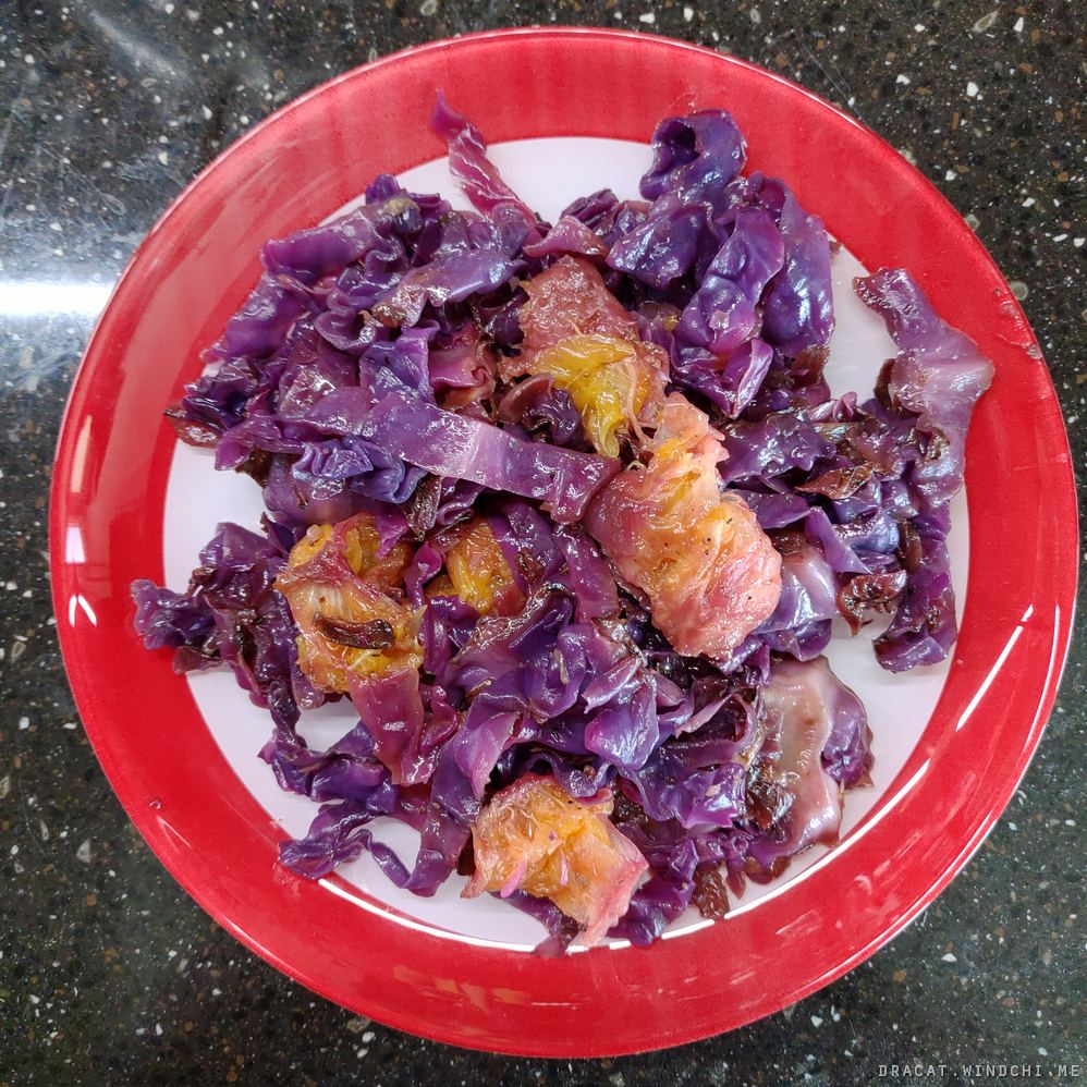 Лук порезать и обжарить в масле на большом огне до золотистости. Кинуть к нему крупно порезанную капусту, перемешать и убавить огонь до среднего. Когда капуста даст сок и станет мягкой как спагетти альданте – добавить очищенный апельсин, разобранный на дольки и порезанный долькам поперек. Перемешать, посолить, поперчить. Съесть.
