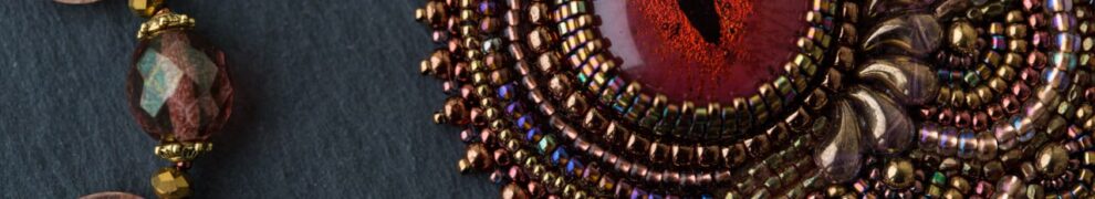 1. Написала осенью Нэсли: “Я хочу попросить у тебя в свободное время и без сроков сделать вещь вот с таким драконьим глазом. Хочу наконец что-то про золотую драконицу. Золотисто-розово-жемчужно-закатное. Возьмёшься?” И она сплела мне бисерное глазастое крыло-пейсли. Много бисера, как я просила. Золотые клыки. Закатные капли. Закрученные в замысловатый пейсли. И глаз работы Тани Мороз. Как же я люблю эту дихроику! У меня ещё такая пентаграмма есть, но она полностью самодостаточна.