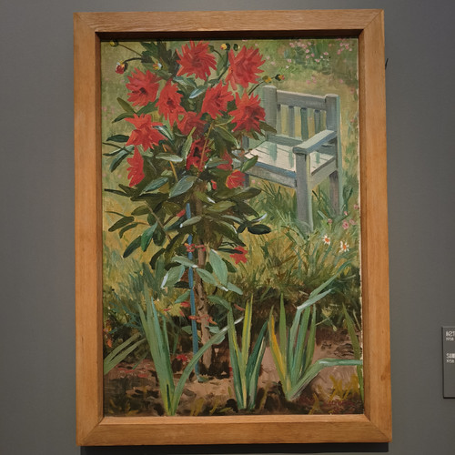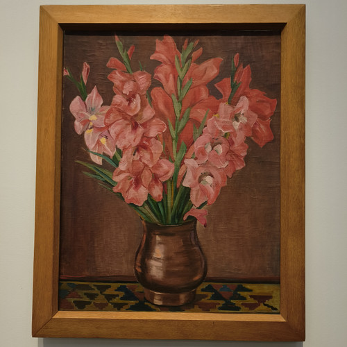 А вот цветы у него выходят наивно, почти импрессионистки. Будто сквозь гладиолусы и георгины пробивается жизнь. И трогательно само то, что это гладиолусы и георгины. В моем детстве на каждой советской даче такие были.