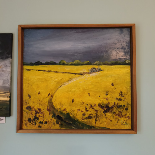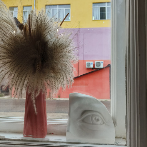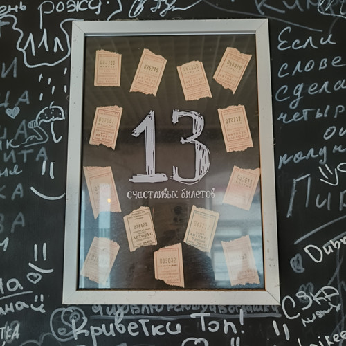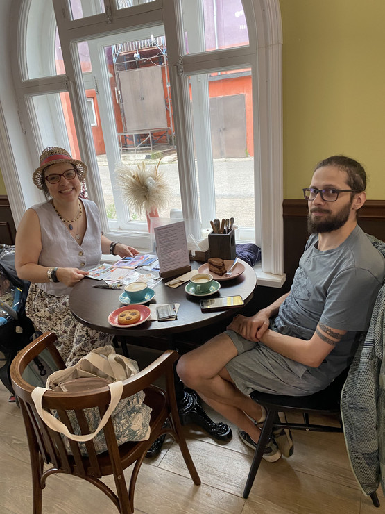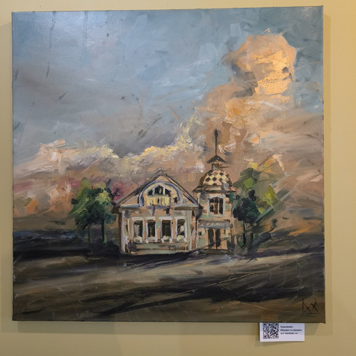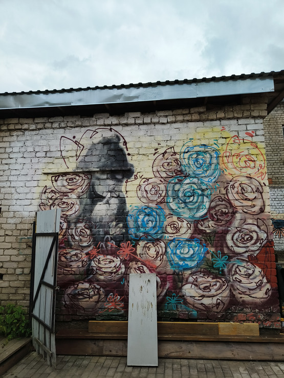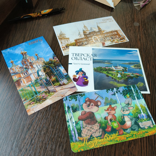 Внутри кафе с соответствующим декором и картинами местных мастеров. Это единственное место в городе, где мне удалось найти почтовые открытки. Поверьте, на них тут есть спрос. В магазине канцелярских товаров на входе висит объявление о том, что открыток нет и не было никогда. Правда в “Теремке” почему-то нарисованы искусственным интеллектом, а не местной художницей Мариеттой Дашян. Её золотое поле перед грозой и почти черно-белая “Улица города К.” мне до сих пор снятся. Мало какие произведения искусства могут эти похвастаться. Ладно, открытки есть и на том спасибо.
