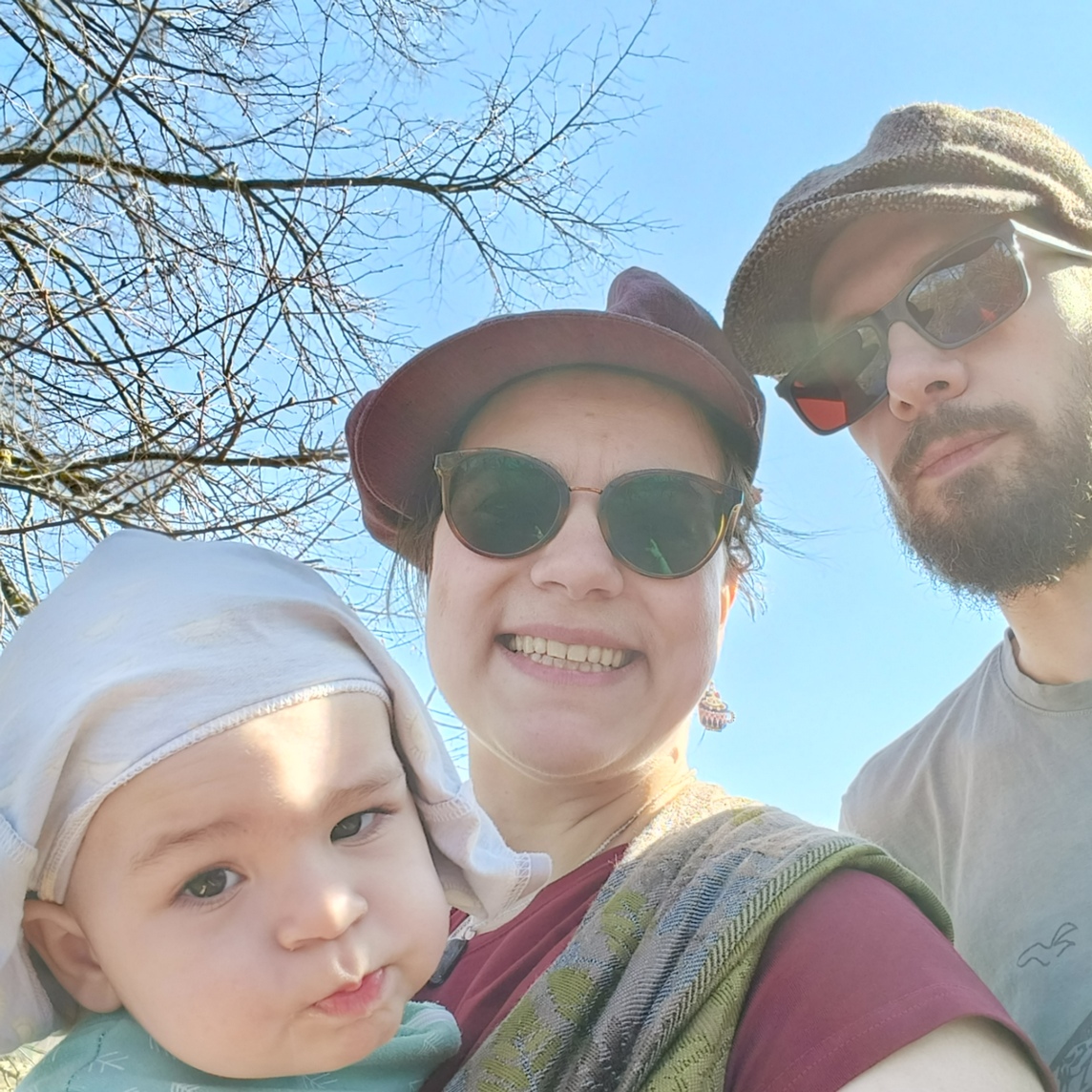 425ый день матерства подходит к концу. На этом фото видно, что если вы озаботились кепочками для всех членов семьи, кроме самого маленького, головной убор легко образуется из подручных средств. На фото мы все в Боголюбово, про которое я задолжала вам пост.