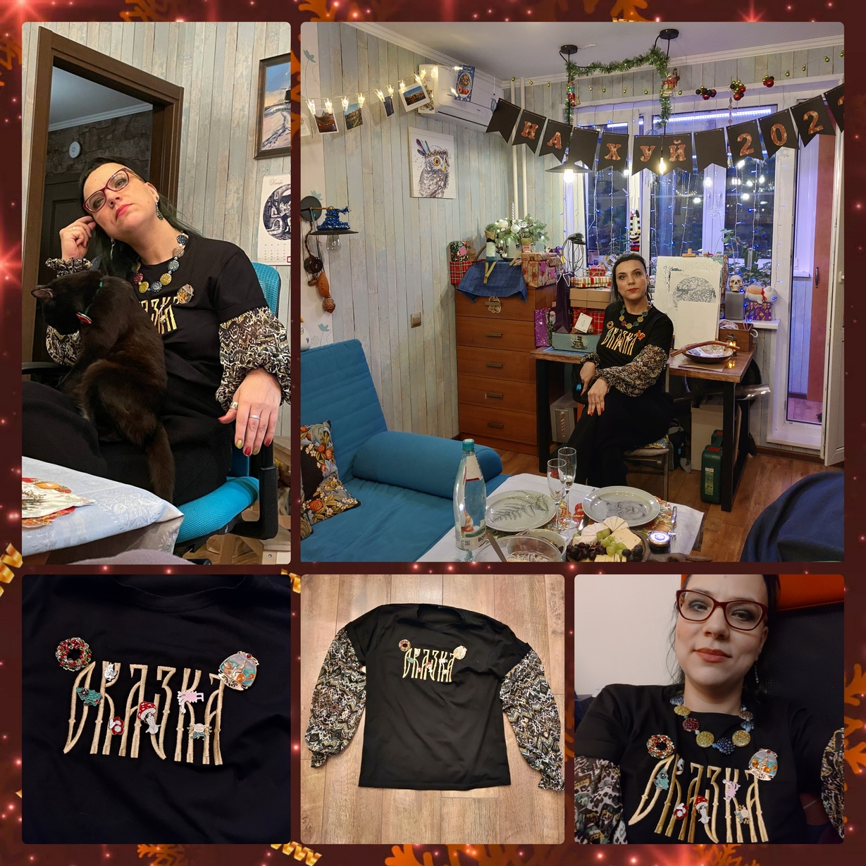 К новому году хотелось гламура во всех смыслах. И сказки. Поэтому я навесила на неведому сказку пины и брошки со всем хорошим, что было в уходящем году и что может принести удачу. Были тут и венок с остролистом и омелой, и красный кот (который сменился в процессе праздника на другого красного кота), и Змей Горыныч цвета сердца сиреневого лепестка, и Муми Тролль с книжкой в позе “на толчке полулежа”, и котик в ёлке, и мухоморская фея. По мере празднования добавился страдающий средневековьем мужик системы “в рот мне ноги” и варежки со снежинками, которые я выиграла в новогодней викторине.