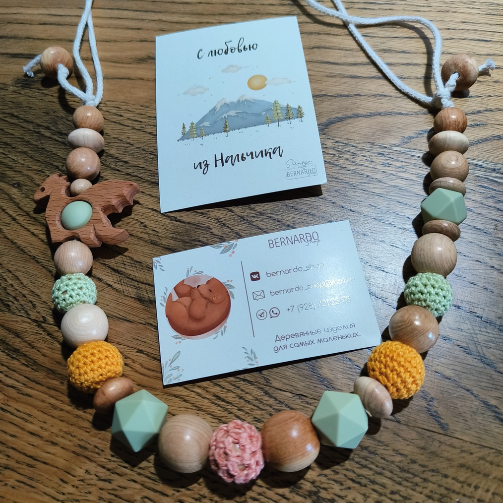 Продолжаю предаваться радостям материнского шоппинга. Заказала в Bernardo shop слингобусы с драконом из можжевельника. Чуть-чуть их было видно в после про футболку с секретом. Мой драконосын пока не очень интересуется таким, но я все попробовала на ощупь и на зуб. Силикон классно жуётся. Хлопок мусолится. Можжевельник и бук пахнут. Будет радость, за что цепляться и что перебирать.