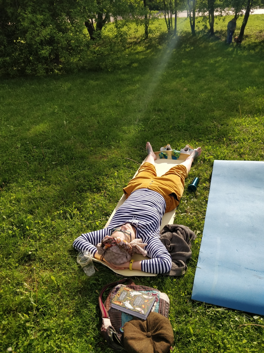 “В чем же тут радость?” – спросит пытливый читатель. А в том, что я так умоталась, что решила: толку с меня ноль сегодня. Муж чуть-чуть отоспался за время моей интервизии, поэтому мы отправились в ближайший парк валяться на траве. Просто взяли пенки и пошли. От недосыпа я становлюсь ужасно рассеянной, поэтому забыла дома телефон. Поняла это, когда мы уже ушли на солидное расстояние и решила не возвращаться. Поэтому два часа валялась в парке. Читала книжку. Крутила платок на голове в разных вариантах. Пила кофе с апельсиновым соком. Искала четырехлистный клевер. Не нашла. Определяла границы земляничной канавы. И разговаривала с черным Дональдом Даком. Фотографировала лед в траве, для чего телефон мне выдал муж. Была полностью счастлива. Меня даже первая мошка в этом году покусала. И муравьи. Много.