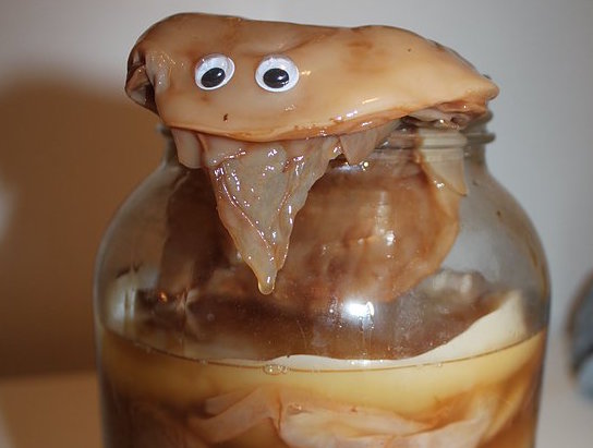 На день рождения деверь подарил мне специальную банку для комбучи. Ну то есть как специальную. Банка с носиком, как для лимонадов и всякого такого стаффа. Кубически-округлая. На три литра. С деревянной крышечкой и даже набором марлечек и бечевкой, чтобы марлечки перехватывать. Чайный гриб пришлось добывать отдельно. Как положено, сделала сладкой заварки и запустила туда пластинку гриба с капелькой уже перебродившего раствора. Он шел в комплекте с грибом. В смысле гриб плавал, как золотая рыбка, в пакете с готовой комбучей. И вот три дня стоит мой чайный гриб раком в банке со сладким пуэром. Пускает пузыри. Щупальцами шевелит. Даром что ли его медузомицетом прозвали? И что-то никак не соберется на поверхность. Уже начиталась всяких форумов. Данные разнятся: то ли надо ждать, то ли спасать. Я выбираю ждать. Такой вот я тревожный огурец с депрессивным бактериально-грибным симбиотом.